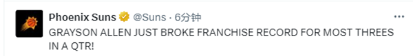 阿伦单节命中7记三分创生涯新高,这也创造了太阳队史单节三分命中数的历史新高,打破了队史纪录。